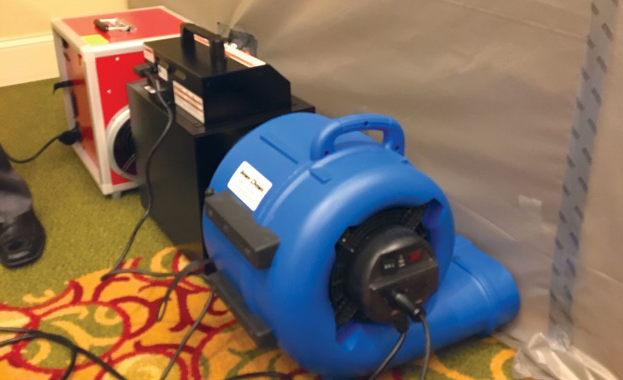 An air scrubber with HEPA filter is set up to create a negative air environment within the containment area. Plus, an air mover pushed hydroxyl radicals into the area to remove any unpleasant odors.