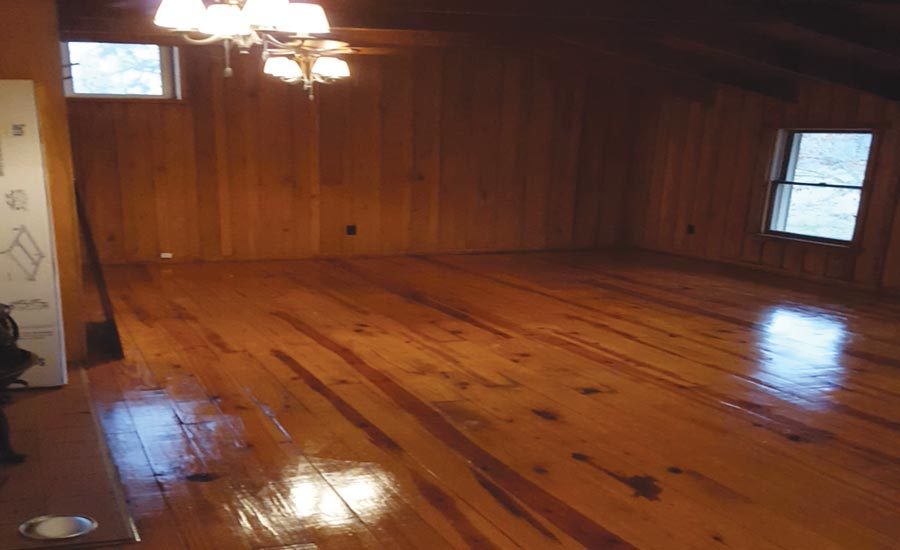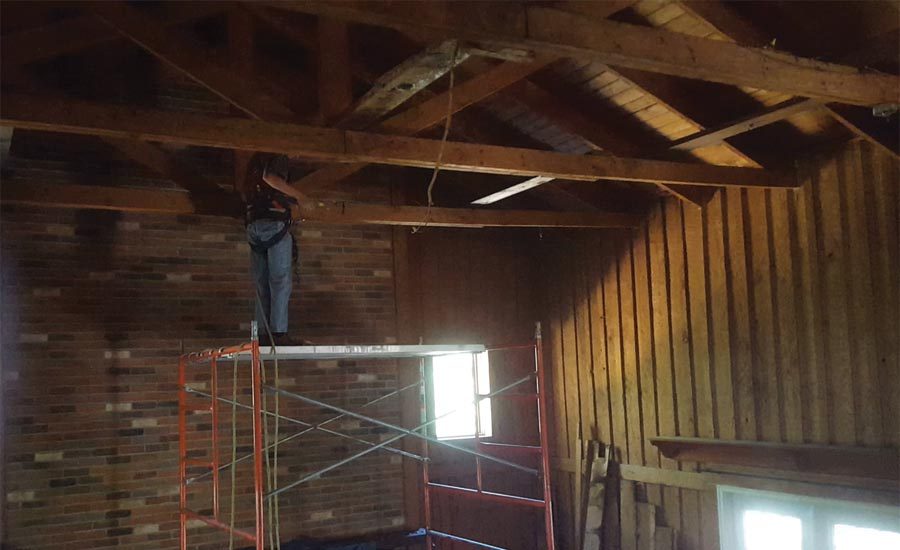 The ceiling in the great room was a whopping 26 feet high, requiring scaffolding. After air washing the structure, we began the process of chemically cleaning all surfaces, vertical and horizontal using a power sprayer to emulsify the smoke residue and capture the waste in the catch basin. Photos courtesy of Ivan Turner