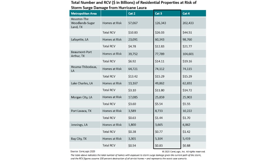 CoreLogic® (NYSE: CLGX), a leading global property information, analytics and data-enabled solutions provider, today released data analysis showing 431,810 single-family and multifamily homes along the Texas and Louisiana coasts with a reconstruction cost value (RCV) of approximately $88.63 billion are at potential risk of storm surge damage from Hurricane Laura based on its projected Category 3 status at landfall. These estimates are based on the August 25, 8 a.m. Eastern Standard Time National Hurricane Center forecast.