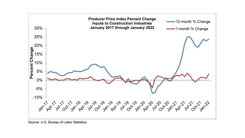 “While many economists expect inflation to moderate over the course of 2022, as of now, there is effectively no relief in sight for the nation’s contractors,” said ABC Chief Economist Anirban Basu. “Inflation remains hot, hot, hot, with estimates of price increases repeatedly coming in above consensus expectations. There was a chunky increase in materials prices in January despite lower natural gas prices. There was also a bit of price relief in metals like iron and steel. But that was more than offset by categories registering price increases, including softwood lumber, plumbing fixtures, concrete and crude petroleum.