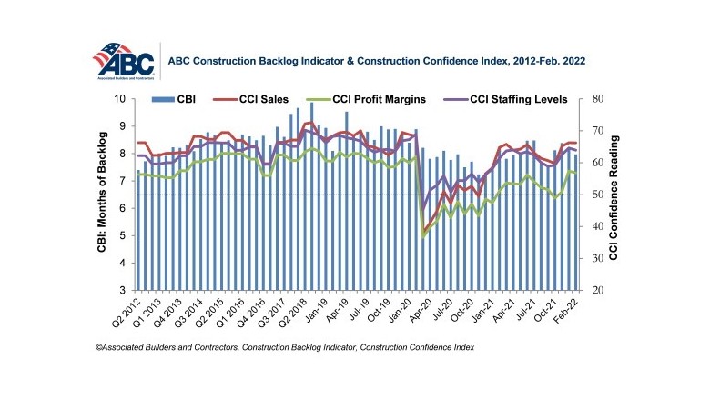 Associated Builders and Contractors reported that its Construction Backlog Indicator remained unchanged at 8.0 months in February, according to an ABC member survey conducted Feb. 21 to March 8. The reading is down 0.2 months from February 2021.