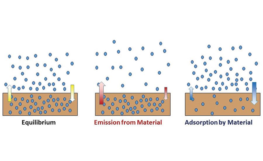 Gaseous chemical contamination can be tricky because it is not visible and may be more or less noticeable depending on the conditions, particularly temperature and humidity. These gases, both VOCs and SVOCs, are adsorbed into porous materials (e.g., carpet, foam cushions or padding, mattresses, fabrics, insulation, etc.) during the fire and subsequently form a balance, or equilibrium, with the gases still in the air. As that balance is disrupted, the gases either flow into (adsorption) or out of (emission) the porous material in order to rebalance their concentrations. So as time goes on and the VOCs in the air are removed by normal air exchange or specific clean up measures, the VOCs adsorbed into the material will slowly be re-emitted and may become noticeable months or even years later, especially on warm and humid days. This results in complaints about smoke odor.