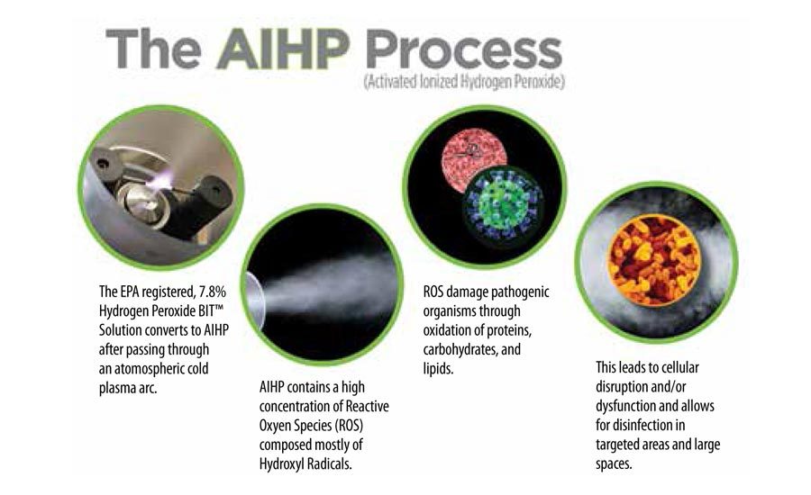 The AIHP platform starts with a low concentration (7.8%) H2O2 solution and is converted to Reactive Oxygen Species, specifically the hydroxyl radical, by passing though High Energy Atmospheric Cold Plasma activation. This breaks the double bonds of the H2O2 creating the highly effective OH radical. This process is the first EPA-registered solution + equipment combination that provides the unique technology of hydrogen peroxide ionization for hospital-healthcare disinfecting.
