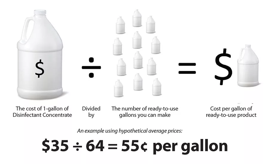 At first glance, one might be tempted to use the simplest math possible when choosing a disinfectant. If you use a concentrated disinfectant that requires mixing with water to create the ready-to-use dilution, it looks like you can save a lot of money. Here’s the calculation: