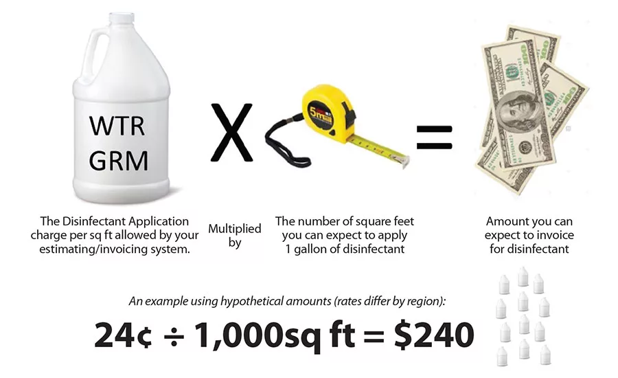 Currently the most common way to charge for applying a disinfectant is to use a line-item code for each square foot of surface applied. Considering that most disinfectants have coverage rates somewhere between 800 and 1,200 sq ft, you are able to bill out a significant amount for that one gallon (remembering of course that the line item amount also includes the labor to apply it and other factors). Check out the math above.