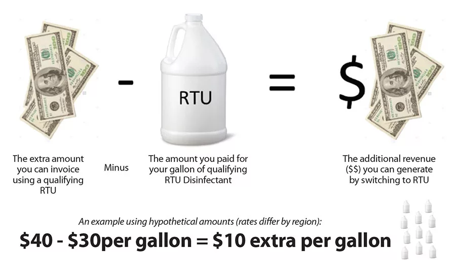 In other words, by switching to an RTU disinfectant that qualifies for the special “Bio” code, you can invoice more additional dollars per gallon than what that RTU gallon costs! Weird right?