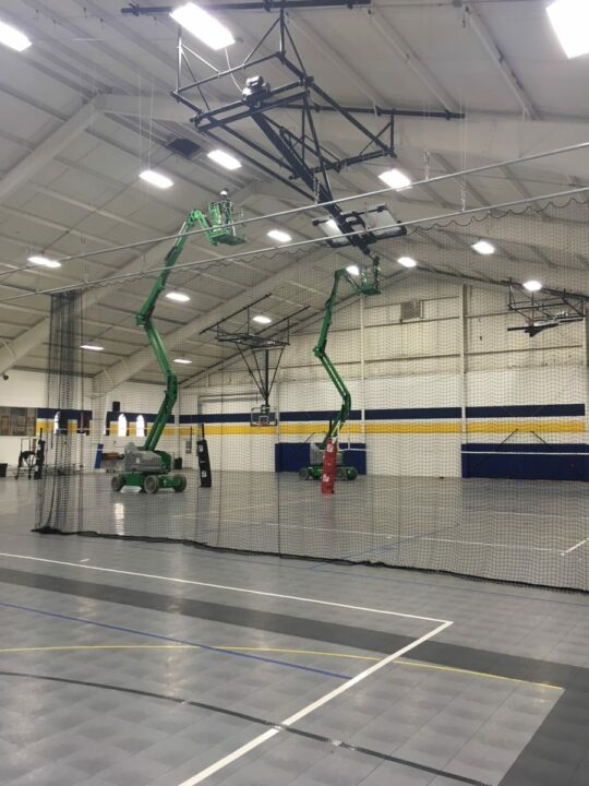 Another challenge was the client's concerns about putting scissor lifts and articulating boom lifts on the volleyball court floor. We had to get the flooring manufacturer involved to determine the load that could be applied to the floor without damaging it. This delayed the project because it took a while for the client to authorize us to use the lifts. In the end, we put plywood down on the volleyball courts to protect the floor even more for the clients’ peace of mind as well as got a statement in writing to assure the client that we could put the necessary lifts on their floors.