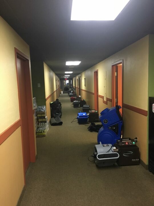 We got the call first thing in the morning and responded immediately to mitigate the damage from the sprinklers first while we came up with a game plan and determined the extent of the damage from the smoke and soot. We also put in a call to Odorox to get us 76 XL-3 machines immediately to begin the deodorization process.