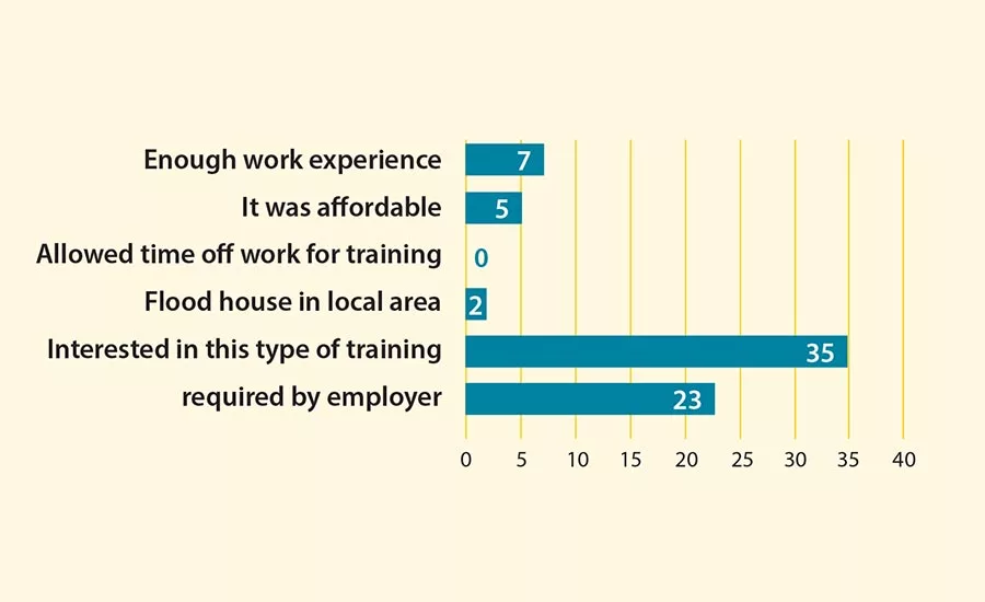 Restoration professionals participated in flood house training due to a variety of reasons (See Figure 5). Forty-nine percent of the restoration professionals participated in flood house training because they are “interested in this type of training.” However, time is not an entry into flood house training.