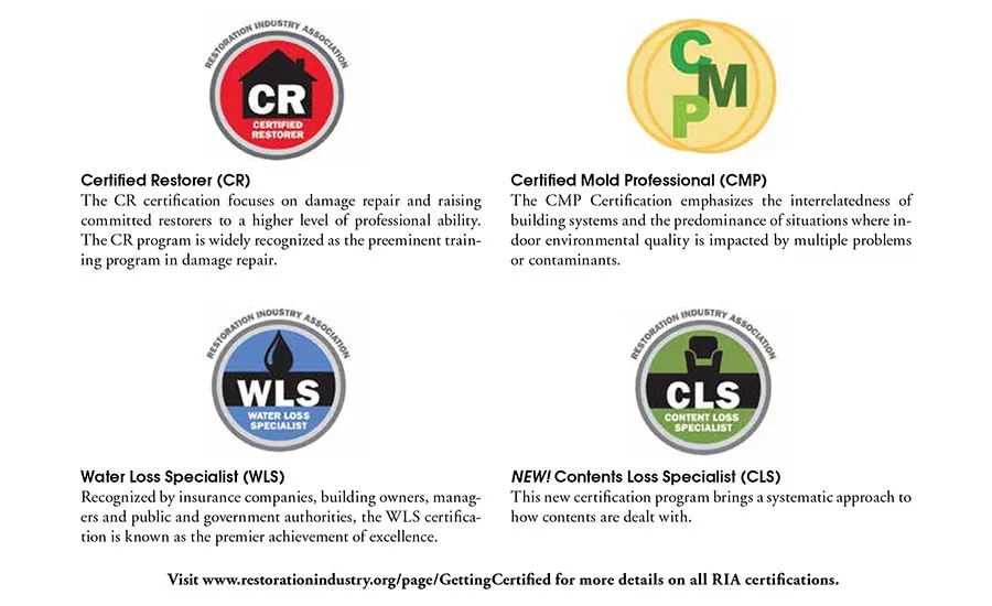 The Restoration Industry Association (RIA) advanced certificants are the premier providers of property and content damage restoration, remediation, reconstruction, and specialty cleaning services to the public. Obtaining a RIA certification will stand you apart as an expert in specific areas of loss we see in the restoration industry.