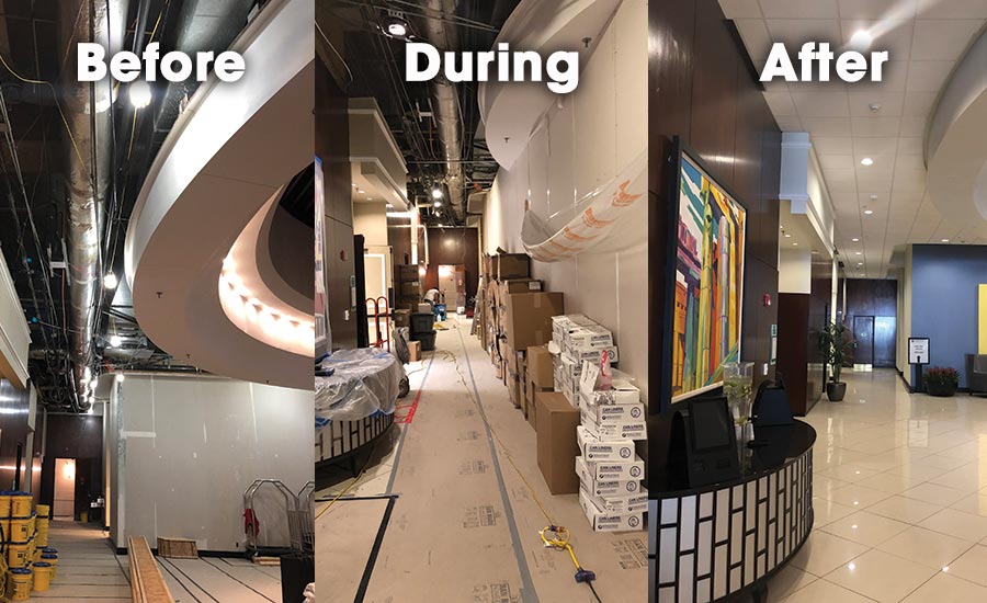 Upon receipt of the environmental report, the decision was made to close the hotel down until an acceptable air quality clearance report could be provided to the owners of the hotel. We had the hotel shut down for 73 days during the process of performing a caustic cleaning. There was roughly 12 months’ worth of work performed during this 73-day period at all levels, from cleaning to bringing the whole building’s fire suppression system and electrical systems up to current code.