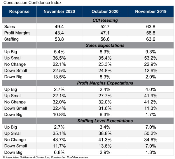 “Many projects have been postponed, while others have been cancelled,” said Basu. “New bidding opportunities have become rarer, helping to push backlog lower. The prospect of additional lockdowns hasn’t helped, with many investors remaining too uncertain to bring the next generation of commercial projects to market. Lending conditions have tightened. Many segments have been battered financially, including healthcare, certain manufacturing sectors and lodging. A number of contractors also report project delivery interruptions as workers become infected. That has helped to dampen confidence, with contractors collectively indicating expectations for lower sales and profit margins over the next six months. At the same time, the emergence of vaccine candidates provides light at the end of the tunnel, but 2021 is shaping up to be a challenging year for many contractors.”