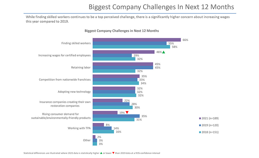 Our State of the Industry study aligned with those poll results perfectly, with 66% saying “finding skilled workers” remains the biggest challenge. Retaining labor was also high, at 45%. Two years in a row, Phil Rosebrook has written about this trend continuing.