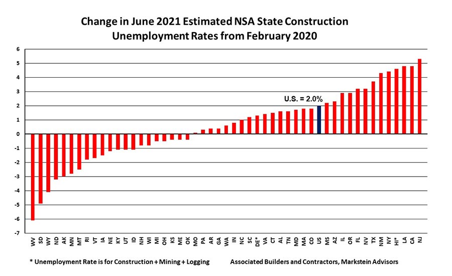 The national NSA construction unemployment rate went from 5.5% in February 2020 to 7.5% in June 2021. During that same period, 21 states had lower estimated NSA construction unemployment rates and 29 had higher rates.