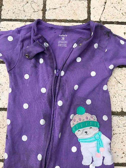 Being somewhat skeptical, I decided to conduct an experiment where I sent a couple articles of smoke damaged clothing to a leading textile restoration company to have them cleaned and deodorized. The articles were a pair of toddler’s purple polka dot pajamas and an infant’s red onesie. Both articles had been in a residential structure fire where a ground floor bedroom was completely gutted and the remainder of the home had moderate to heavy smoke damage throughout. Both articles were taken from a room that was furthest away from the fire source and both had a very strong smoke odor.