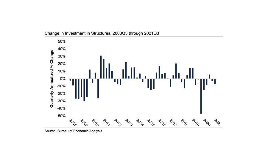 Investment in nonresidential structures contracted at an annual rate of 7.3% during the third quarter of 2021 and has now contracted during seven of the past eight quarters, according to an Associated Builders and Contractors (ABC) analysis of data released by the U.S. Bureau of Economic Analysis. The overall economy expanded at a 2.0% annualized rate during the third quarter of 2021.