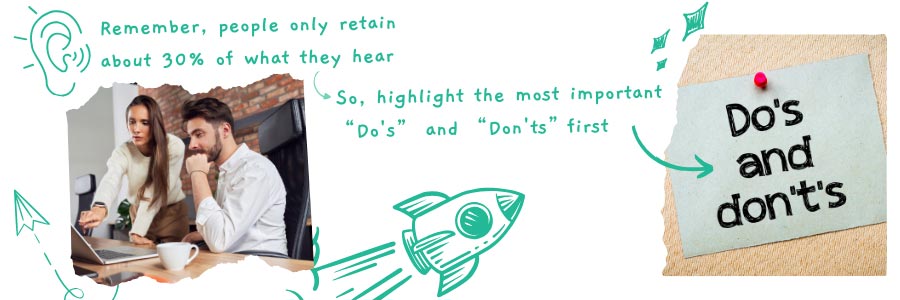 Next up, guide them through the company rules and guidelines. Remember, people only retain about 30% of what they hear, so highlight the most important do’s and don'ts first. This way, they grasp the key points needed to navigate the workplace successfully.