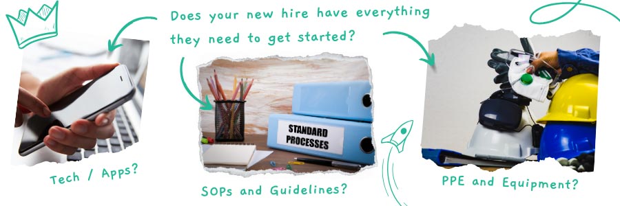 Check that the new hire has all the materials, resources, and equipment they need before starting. This includes Personal Protective Equipment (PPE), technology, apps, and other resources specific to their role. Make sure they download any necessary communication apps and meet the minimum technological requirements. Set them up for success from day one.