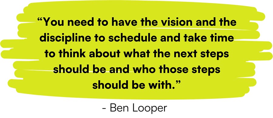 “You need to have the vision and the discipline to schedule and take time to think about the next steps and who those steps should be with,” Ben explains.