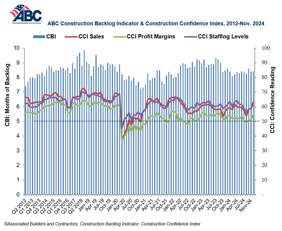 Associated Builders and Contractors reported today that its Construction Backlog Indicator remained unchanged at 8.4 months in November, according to an ABC member survey conducted Nov. 20 to Dec. 3. The reading is down 0.1 months from November 2023.