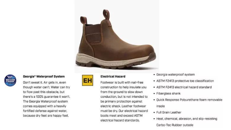 The boots are built with a full-grain leather upper and features twin gore panels with nylon pull loops for a secure fit and quick on/off. Inside, the high-performance mesh lining boosts breathability, while the Georgia Waterproof System keeps feet dry in wet conditions. The polyurethane insole provides responsive cushioning and is removable for easy cleaning or replacement. The dual-density EVA and Carbo-Tec™ rubber outsole resists heat, chemicals, abrasions, and slips—making it ideal for a variety of tough work environments.