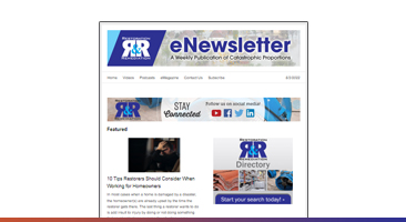 The Restoration Insider newsletter is a weekly newsletter with information for professionals working in disaster restoration and remediation. It delivers the latest industry news and events, new technologies and equipment, and more right to your inbox.